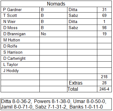 On a gloriously hot day (20 degrees hotter than last week), Nomads travelled to new opponents Springhill. Winning the toss for the first time this season, Hutton sent the opposition in to field to give our boys cooler temperatures after tea. Gardner opened with Scott, an occasional Nomads player, and both set off at a brisk pace. The fast outfield and shortish boundaries enabled the openers to score in fours saving their energy for the later stages. Having reached the 10 overs at nearly 5 per over, Gardner, who has looked to be playing with more confidence this season, was bowled at 31. Weir was in briefly, avoiding the gonad, and then giving way to Moss. Moss had had some net practice during the week and looked in better touch than in the opening match. He and Scott set about the bowling, only being restricted by Sabz who bowled at a good pace off a short run, and achieved an impressive partnership of 130 before Scott was bowled for 69, after earlier being dropped by loanee fielder Cartwright. Moss and Brannigan really went for quick runs; the unfortunate Jamil having 29 scored off his last over. With Moss only wanting a couple of runs off the last over, the spectators decided to let him know, which, he told us later, that he would have preferred not to have known, and was bowled for 98 off the last ball, with Nomads achieving an impressive target of 246-4.