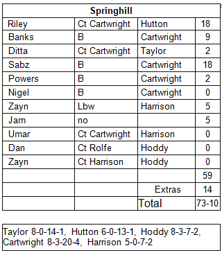 Taylor and Hutton calmed the fears with their usual tight bowling, both bowlers deserve more wickets than they seem to get. None of the batsmen could score quickly and Cartwright, Hoddy and then Harrison maintained the pressure, Springhill being all out for 73. Cartwright pipped Moss for MVP with 4 wickets and 3 excellent catches, which must have made the opposition wonder how he could have failed to take a simple chance when fielding for them. Young Zayn was invited back to bat as the opposition had only 10 men and was soon out, letting the Nomads have a much needed drink in the club bar. A very enjoyable fixture which hopefully will be repeated next year.