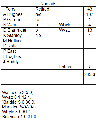 A late start enabled the players to watch England demolish Panama, and Nomads were able to bat first on a scorching day in Halesowen. The late arrival of Gardner saw Adam Hughes open the batting with Ian Terry in a 35-over match. The opening bowlers restricted the scoring for a while but then our openers started to up the pace which was aided by a double bowling change which saw the run-rate getting up to 5 per over. In particular Hughes started to take control and was only 11 short of his century when his partner found the heat too much for him and retired allowing Gardner to come in to bat. Unfortunately Gardner was run out for only 1. Weir saw Hughes reach his maiden Nomad's century before he was bowled. Brannigan scored 13 quick runs and then Stanley had a brief 'red-inker' for 4 by which time Hughes had reached 137 not out.