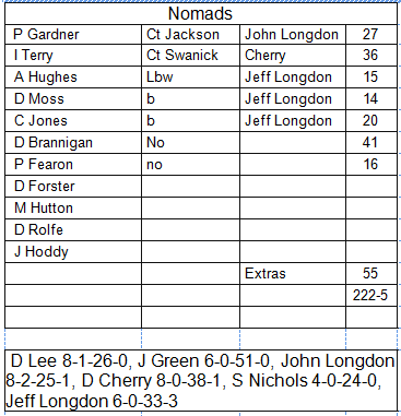 Looking at the Sunseekers scorebook showed that they had achieved several scores over 200 so Nomads had no false illusions about an easy victory.