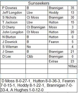 Hutton and Moss started with their usual economic bowling against an assured pair of openers. After half their allotted overs they were replaced by Fearon and Hoddy. The latter not having played for 3 weeks bowled a slow loosener which the batsman misjudged and was given out lbw. Wickets then steadlily fell, aided by some excellent catches, with Brannigan taking 4 off his short run and Hutton claiming 3 to dismiss Sunseekers in the last over on 169.