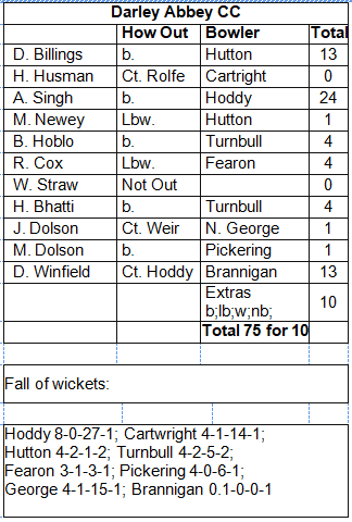 Hoddy and Cartwright opened the bowling and Dazzler struck first, Husman edging to keeper Rolfe. Billings (13) and Singh (24) produced the best partnership for Darley Abbey but when they were dismissed by Hutton and Hoddy the wickets began to fall regularly and their run chase became academic. The wickets were spread around, two for Hutton and Turnbull and one each for Hoddy, Cartwright, Fearon, Pickering and George.