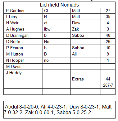 Scores: Lichfield Nomads 207 for 7, Springhill 194 for 7
