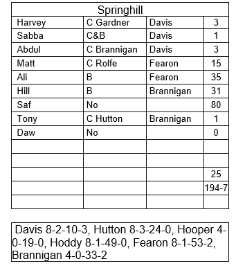 Hutton elected to bat after winning the toss and Gardner and Terry got off to the best start of the season so far. Scoring at a steady rate, ably helped by extras. The Springhill bowlers seemed rusty to start with but settled down and, on a slow outfield scoring was not that easy. Gardner lasted until the 17th over before his wicket was claimed by an instinctive slip catch. Weir, hoping to build on his 35 of the first match, was bowled a demon ball which lifted sharply and was adjudged caught behind by the umpire although Weir was confident that he had not hit it. Adam Hughes also did not give the scorer too much work to do being out lbw to a less contentious decision. Terry was riding his luck and could have been run-out on a couple of occasions if the home fielders had been a bit calmer. Brannigan arrived at the crease and proceeded on a typical Brannigan innings scoring quickly to try to attain the captain's target of 200 to 220 runs. Unfortunately he fell just short of his 50. Rolfe also continued his run of good form achieving 26no. Fearon and Hutton also chipped in some quick runs and the end of the inning saw Nomads debutant Niall Hooper score his first Nomad's run.