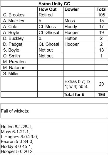 After drinks Aston Unity began upping the tempo and opener Brookes, already on 50, despite a bleeding hand, showed some nifty footwork accompanied by a variety of powerful shots as he pressed on towards a deserved century. He retired having laid a strong platform for the hosts to post a big score.