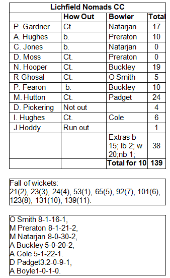 Hutton and Moss opened the bowling and Moss' uphill spell ended after one loose over as he struggled to get to grips with the slope. Hughes took over and bowled a decent line and length and was unlucky to go wicketless. Hutton was hitting some good areas and bowling with pace and the Nomads started to reign in the run rate. Moss returned from the top end and looked a lot happier and bowled with excellent control, bowling Muckley for 15.