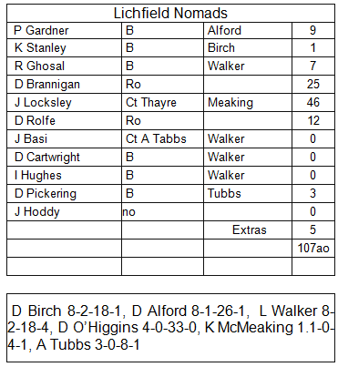 Scores: Lichfield Nomads 107 all out, Tipton St John 109 for 3