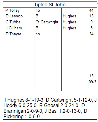 Hughes and Cartwright opened with Hughes having some success by claiming 3 wickets. However with a meagre target of 108 to win Tulley and Thayre did not have to take any risks and once in sight of the target, Rolfe brought on some of his part-time bowlers to give them match practice and the total was easily attained in the 26th over.