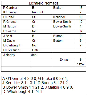 A score of 112 looked well short of par but Nomads went out on the field determined to try their best. Davis and Hutton bowled very aggressively at the start of the innings but at the speed they were bowling any contact with the bat saw the ball racing to the boundary so the first 8 overs were very lively. The third wicket fell in the 11th over with the score on 41, but then Wood and O'Donnell started a partnership. O'Donnell smashed the ball for four given half a chance and Wood pushed his score along without taking undue risks. Hoddy and Cartwright bowled with no success and Fearon was brought on and managed 2 balls before the winning run was struck. Nomads only consolation was that we lasted until after drinks.