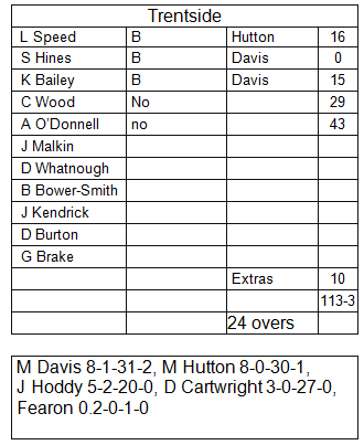This is a tough fixture with the Trentside team being a mix of older players with plenty of experience, now struggling to find a place in the league teams, not because of lack of ability but preference being given to the young players. Then there are a sprinkling of youngsters plus at least one player who can score runs quickly. Against this opposition we needed at least 180 on the board and fell well short.