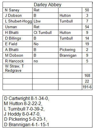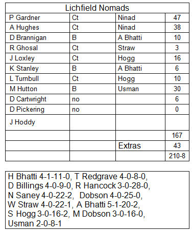 Scores: Lichfield Nomads 210 for 8; Darley Abbey 191 for 6