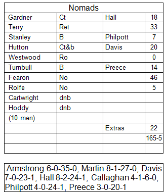 Nothing particularly went for the Nomads with catches evading the fielders and the bat being beaten a number of times to no avail. The field was lightning fast and the Nomads suffered towards the end in the hot conditions with only 10 men. Westwood had introduced new man Turnbull, from deepest Derbyshire, and he looked better than his bowling figures appear to show.