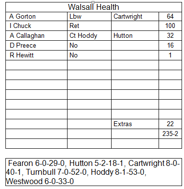 On a scorching day Nomads were asked to field and the 2 Walsall openers achieved their usual good scores. Chuck retired on 100 continuing a rich vein of form, and Gorton achieved 64 before being given lbw to Cartwright, having become the Elfs' Competition leading run maker. Hoddy finally managed to take a catch off Hutton's bowling having dropped one in the deep off Cartwright and Elf reached a formidable 235-2.